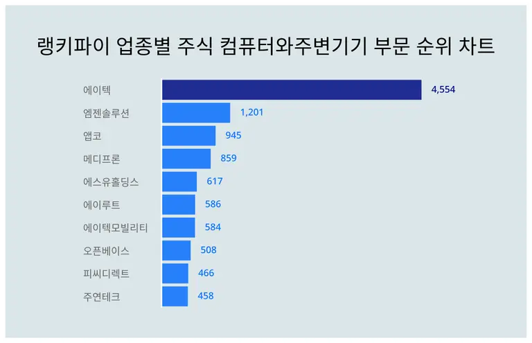 업종별 주식 컴퓨터와주변기기 부문 트렌드지수에서 에이텍 주가는 2024년 4월 3주차 트렌드지수 분석 결과 1위를 차지했다.