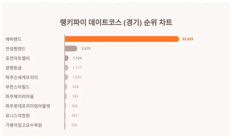에버랜드가 트렌드 지수 33,625포인트로 4월 4주차 데이트코스 (경기) 트렌드 지수에서 1위에 올랐다.