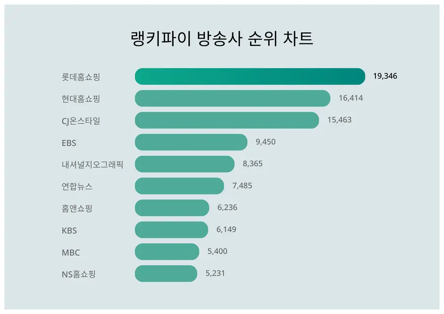 4위 EBS는 9,450포인트, 5위 내셔널지오그래픽은 8,365포인트, 6위 연합뉴스는 7,485포인트, 7위 홈앤쇼핑은 6,236포인트, 8위 KBS는 6,149포인트, 9위 MBC는 5,400포인트, 10위 NS홈쇼핑은 5,231포인트이다.