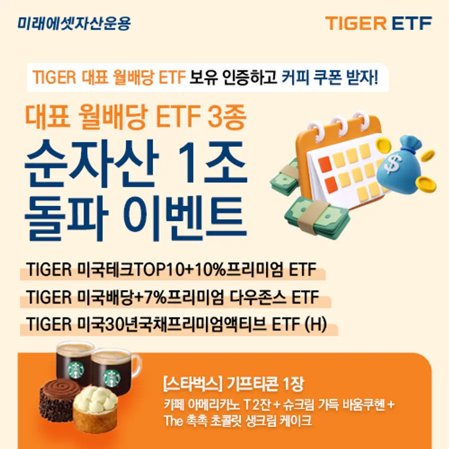 미래에셋자산운용은 TIGER 프리미엄 월배당 ETF 3종의 총 순자산 1조원 돌파를 기념해 고객 이벤트를 진행한다. 5월 6일까지 해당 ETF를 보유 인증한 참여자 중 추첨을 통해 기프티콘을 증정한다. 자세한 이벤트 내용은 TIGER ETF 홈페이지에서 확인할 수 있다.