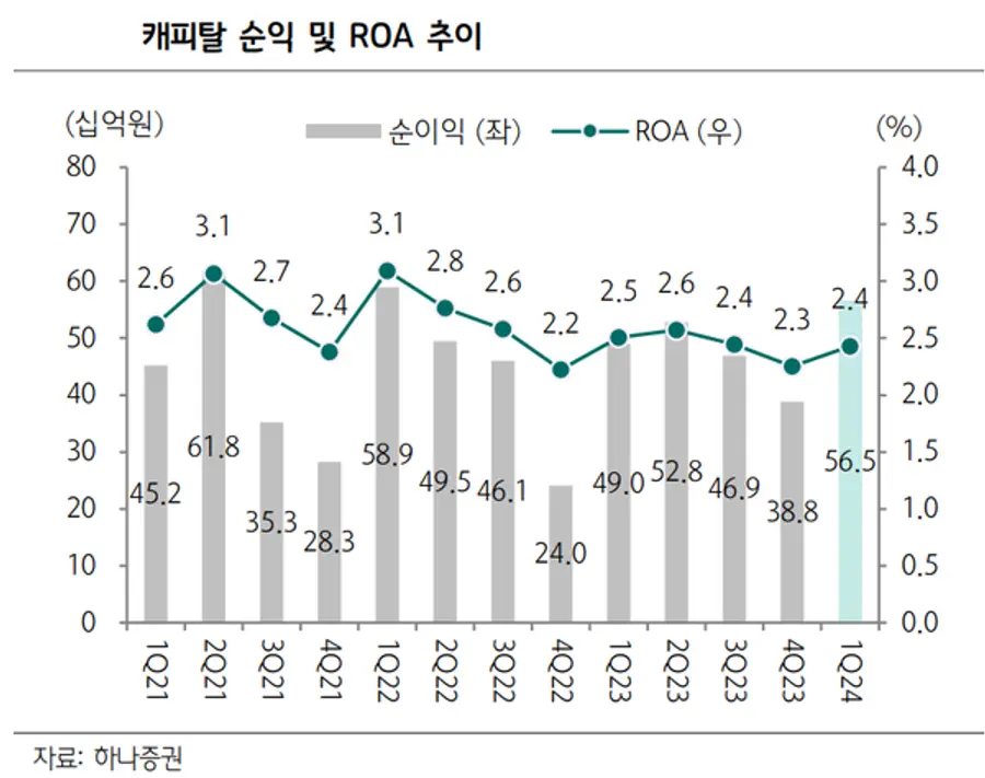 최정욱 하나증권 애널리스트는 23일 보고서에서 "1분기 실적은 하나증권 예상치에 정확히 부합했다"며 "수수료 이익이 견조했고, JB우리캐피탈의 순이익도 증가했다"고 밝혔다.