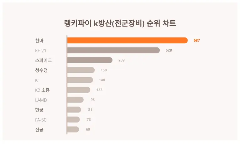 천마가 트렌드 지수 687포인트로 랭키파이 4월 4주차 k방산(전군장비) 트렌드 지수에서 1위에 올랐다.
