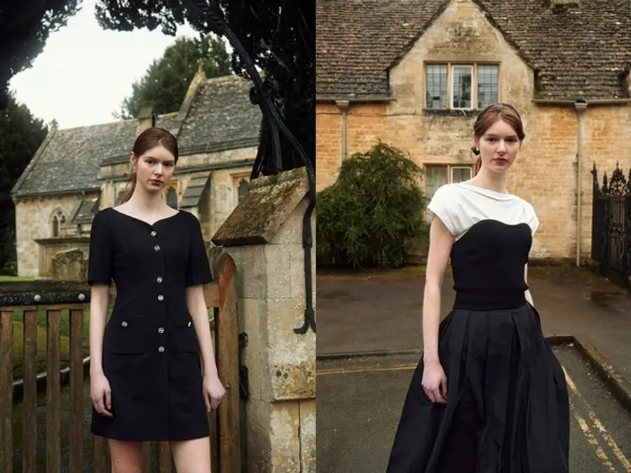 화보 속 나풀거리는 오간자 소재의 백 리본 블라우스와 수트 코디는 중요한 하루의 포인트가 되어 주며, 페미닌한 무드의 리본 디테일이 가미된 구조적인 블랙 드레스는 우아한 매력을 한층 돋보이게 해주어 웨딩 시즌마다 고민이 가득해지는 하객룩의 해답이 되어 줄 아이템으로 제안한다.