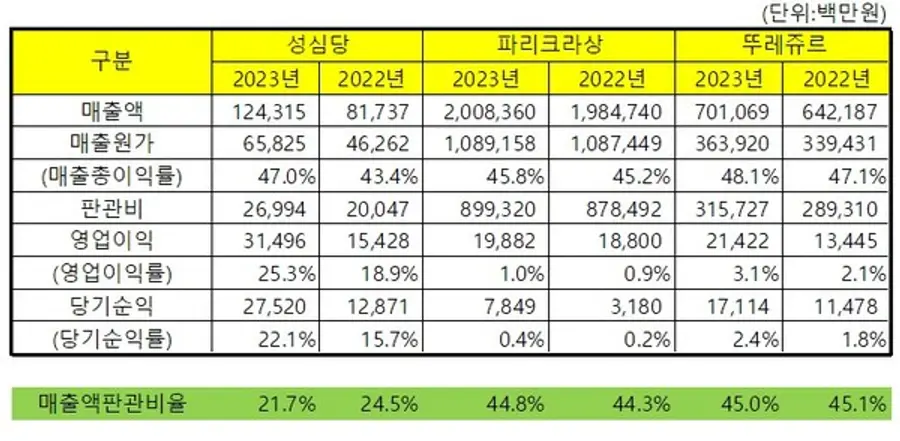 성심당의 매출액판관비율은 21.7%에 그친 데 반해 파리크라상과 뚜레주르는 각각 44.8%와 45%로 두 배 가량 높았다.