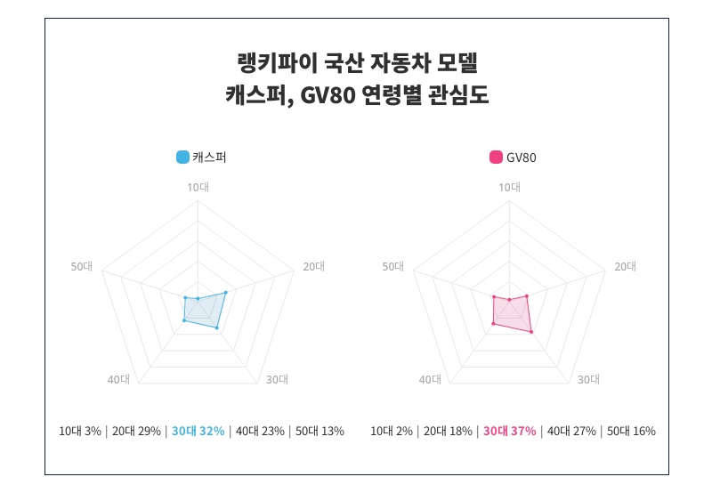 한편, GV80은 30대에서 37%의 관심도로 가장 강력한 관심 연령층을 형성하고 있으며, 이외에도 10대 2%, 20대 18%, 30대 37%, 40대 27%, 50대 16%로, 광범위한 연령대에 걸친 관심을 확인할 수 있었다. 이러한 데이터는 두 트렌드가 다양한 세대에 걸쳐 어떻게 다르게 어필하는지를 보여주는 흥미로운 지표가 되고 있다.