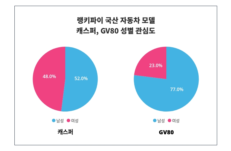 성별 관심도 부문에서 캐스퍼의 성별 관심도와 GV80'의 성별 관심도가 어떻게 분포되어 있는지에 대한 분석이 공개되었다.