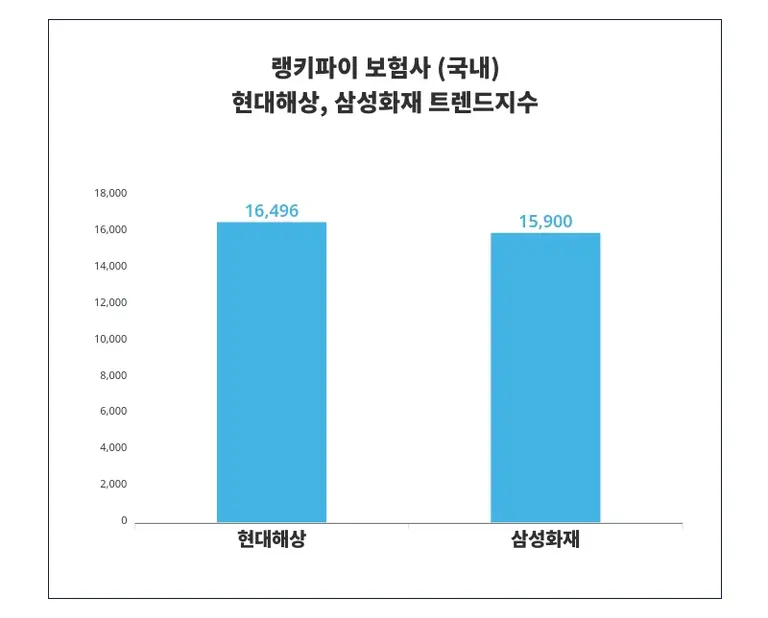 보험사 (국내) 트렌드 지수에서 현대해상은 '16,496포인트'로 삼성화재의 '15,900포인트'보다 '596포인트' 차이로 앞서는 것으로 나타났다.