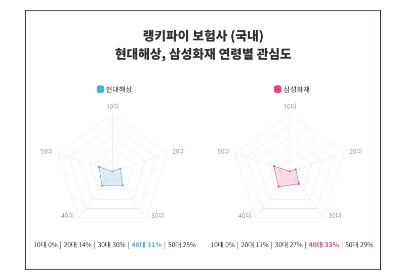 선두자리에 있는 현대해상이 '40대'에서 '31%'로 가장 높은 관심을 보이는 것으로 나타났으며 10대 0%, 20대 14%, 30대 30%, 40대 31%, 50대 25%로 각각의 연령대에서 얼만큼 관심을 받는지 알 수 있다. 또한 뒤를 잇는 삼성화재가 '40대'에서 '33%'로 가장 많은 지지를 받는 것으로 밝혀졌고, 10대 0%, 20대 11%, 30대 27%, 40대 33%, 50대 29%로 다양한 연령대의 관심을 확인 할 수 있다.