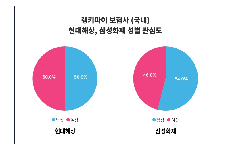 성별 관심도 분석 결과, 현대해상은 '남성'에게 '50%'로 지지를 받았으며, 현대해상은 남성보다 '남성'에게 더 많은 관심을 받고 있었다. 그 뒤를 이어 삼성화재는 '남성'에게 '50%' 지지를 받았으며, 삼성화재는 남성보다 '남성'에게 더 많은 관심을 받고 있음이 드러났다.