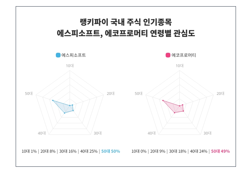 연령별 관심도 부문에서 에스피소프트의 연령별 관심도와 에코프로머티'의 연령별 관심도는 위와 같이 나타났다.