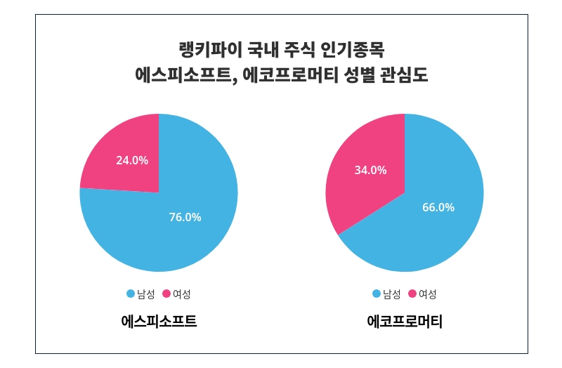 성별 관심도 분석 결과, 에스피소프트는 '남성'에게 '76%'로 지지를 받았으며, 에스피소프트는 여성보다 '남성'에게 더 많은 관심을 받고 있었다. 그 뒤를 이어 에코프로머티는 '남성'에게 '76%' 지지를 받았으며, 에코프로머티는 여성보다 '남성'에게 더 많은 관심을 받고 있음이 드러났다.