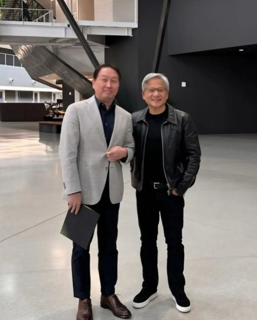 SK그룹 관계자가 사진들을 찍어준 것으로 보인다. 공식 석상에서는 항상 검은 가죽자켓을 입는 젠슨 황. 최 회장과의 만남에서도 같은 옷차림이었다.