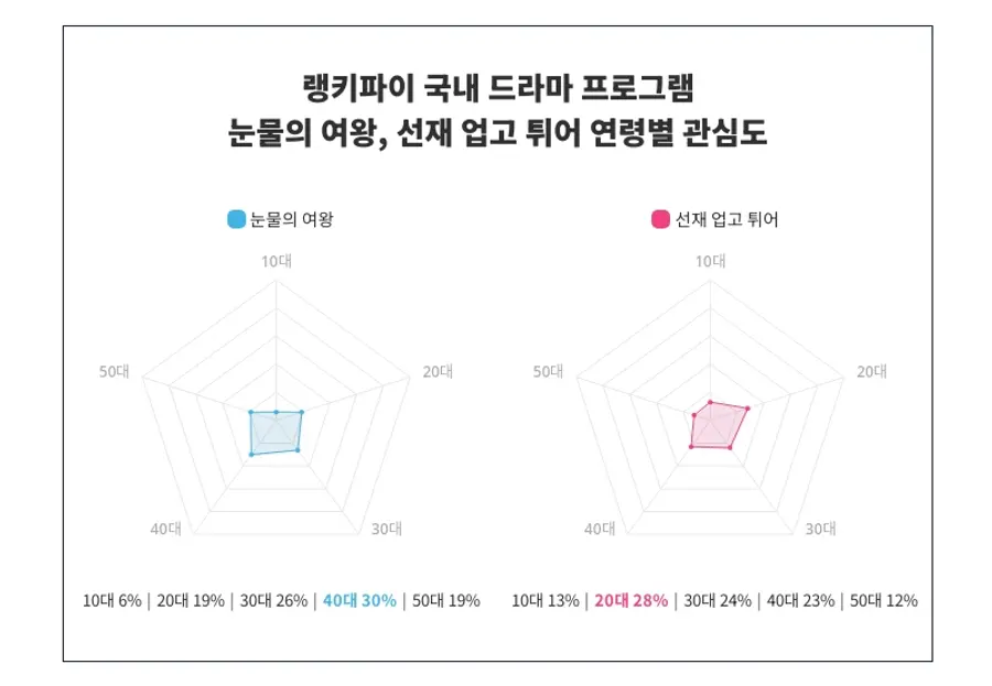 연령별 관심도 조사에서 눈물의 여왕과 선재 업고 튀어의 관심도가 다양한 연령층 사이에서 어떻게 분포되어 있는지가 명확히 드러났다. 조사 결과, 눈물의 여왕은 특히 40대에서 30%의 높은 관심도를 기록하며 가장 큰 관심을 끌고 있는 것으로 나타났다. 눈물의 여왕의 인기는 10대 6%, 20대 19%, 30대 26%, 40대 30%, 50대 19%순으로 이어지며, 각 연령대별에서 어떤한 관심을 받고 있는지 조사되었다.