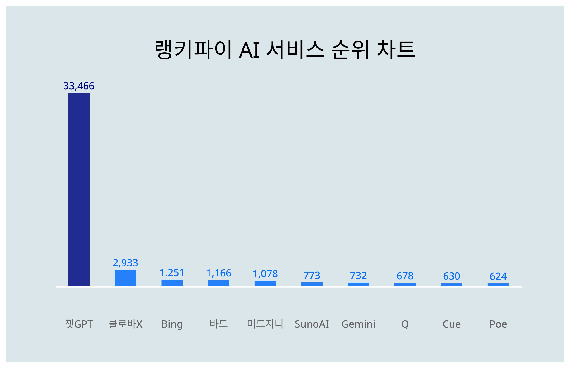 1위인 챗GPT는 33,466포인트로 전주보다 6,233포인트 하락했다.