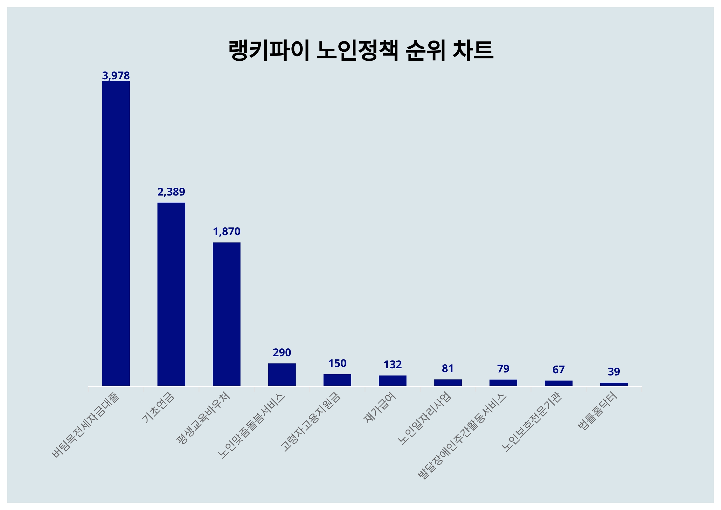4위 노인맞춤돌봄서비스는 290포인트, 5위 고령자고용지원금은 150포인트, 6위 재가급여는 132포인트, 7위 노인일자리사업은 81포인트, 8위 발달장애인주간활동서비스는 79포인트, 9위 노인보호전문기관은 67포인트, 10위 법률홈닥터는 39포인트이다.