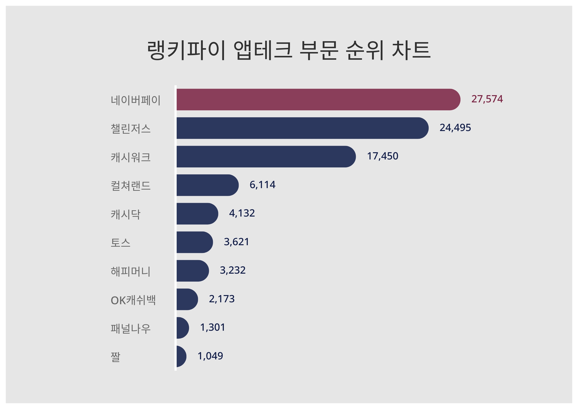 AI기반 빅데이터 프로그램을 갖춘 랭키파이는 각 분야별 트렌드지수를 도출한다. 이날 분석에 따르면 네이버페이가 4월 5주차 기준 앱테크 부문 부문 트렌드지수 1위로 집계됐다.