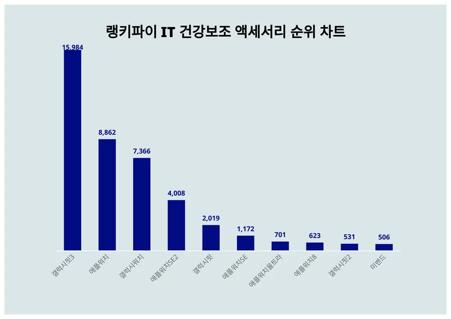 차트를 살펴보면 갤럭시핏3이 15,984포인트로 해당 부문 1등을 기록했다. 바로 뒤 애플워치가 8,862포인트로 2등을 차지했다.