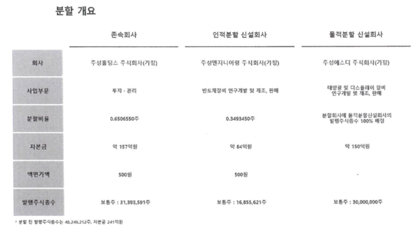 우선 반도체 장비 부문을 분할존속회사 0.65 대 분할신설회사 0.35의 비율로 분할한다. 분할존속회사는 주성홀딩스로 사명이 바뀌고 자회사와 피투자회사 및 신규 투자 등으로 목적으로 하는 지주회사가 된다. 반도체 장비 부문은 주성엔지니어링이라는 현재의 사명을 이어받는다.