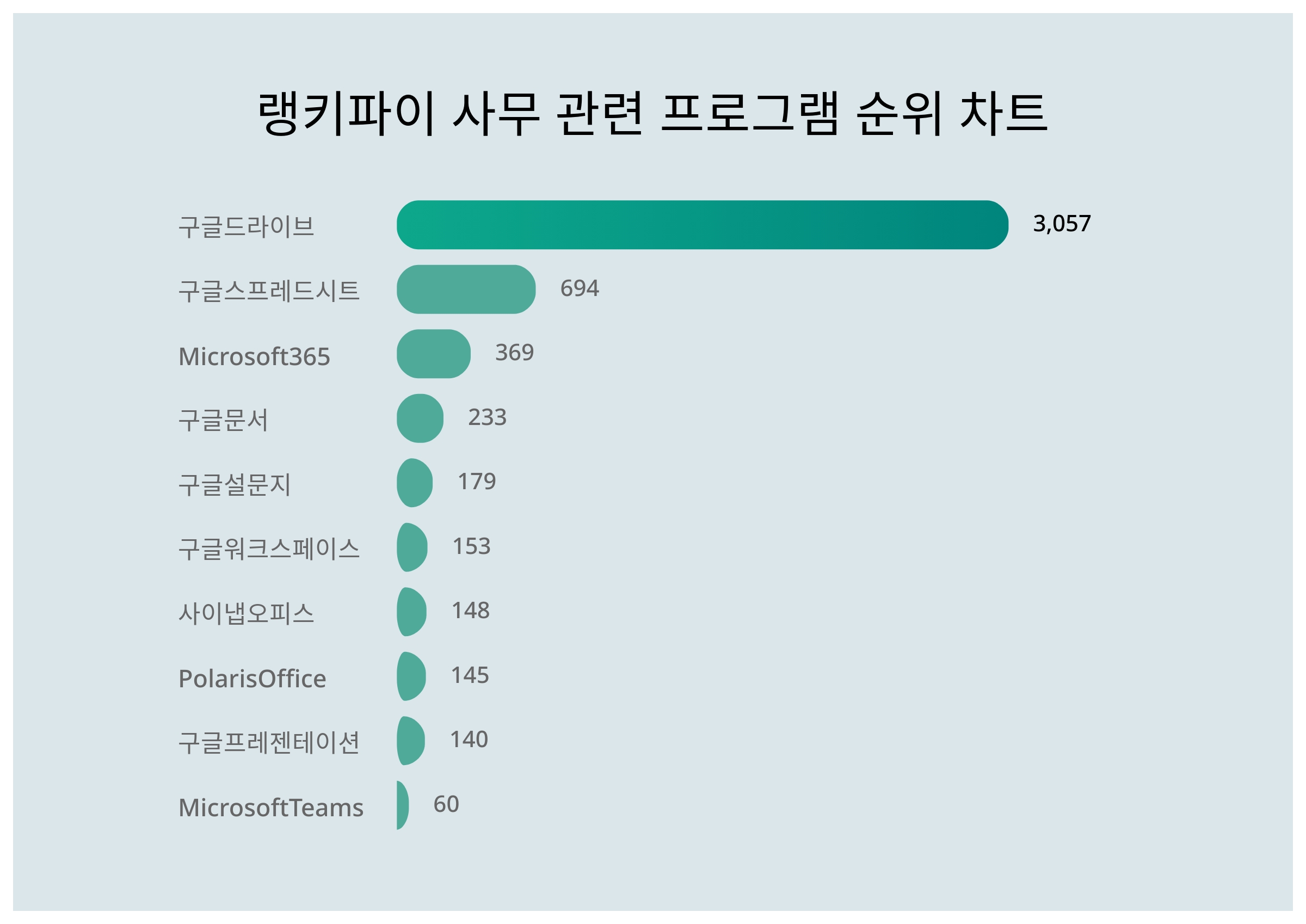 랭키파이가 빅데이터로 분석한 결과에 따르면 구글드라이브가 1위로 선두를 달리고 있다. 뒤를 이어 2위 구글스프레드시트, 3위 Microsoft365로 나타났다.