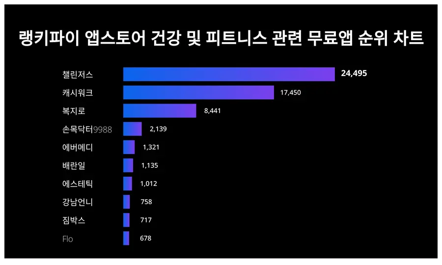 AI기반 빅데이터 프로그램을 갖춘 랭키파이는 각 분야별 트렌드지수를 도출한다. 이날 분석에 따르면 챌린저스가 4월 5주차 기준 앱스토어 건강 및 피트니스 관련 무료앱 부문 트렌드지수 1위로 집계됐다.
