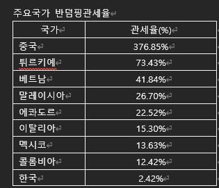 같은 날 예비판정을 받은 중국산 알루미늄에는 376.85%의 폭탄 관세가 부과됐다. 아울러 튀르키에 (73.43%), 베트남(41.84%) 등 높은 관세가 대미 수출 주요 국가에 청구됐다. 한국은 상대적으로 가장 낮은 2.42%가 청구되어 대미 수출 경쟁력을 계속 유지할 수 있게 되었다.