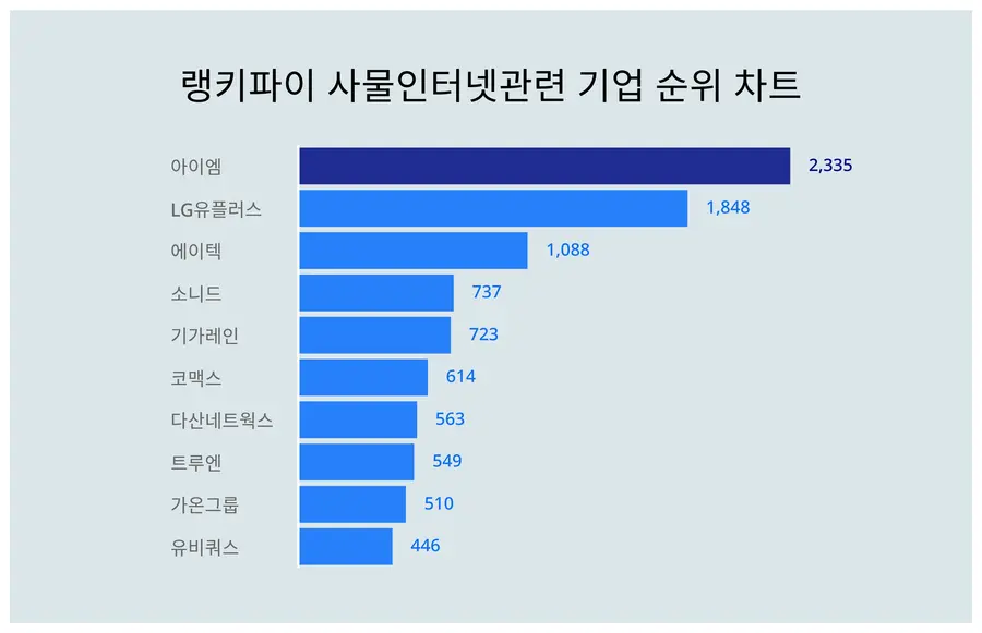 랭키파이가 빅데이터로 분석한 결과에 따르면 아이엠이 1위로 선두를 달리고 있다. 뒤를 이어 2위 LG유플러스, 3위 에이텍 순으로 나타났다.