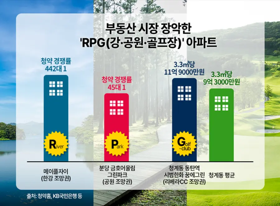강·공원·골프장을 향해 지어진 아파트는 빼어난 조망권 덕에 높은 청약경쟁율을 보이고 있다. 한국부동산원 청약홈에 따르면 올해 1분기 전국에서 10대 1 이상의 청약경쟁률을 기록한 아파트 단지 12곳 중 8곳이 RPG 입지를 갖춘 곳이었다.