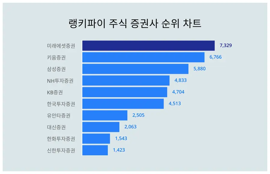 | 1 | 미래에셋증권 | 7,329 | 1% | 10% | 17% | 27% | 45% |