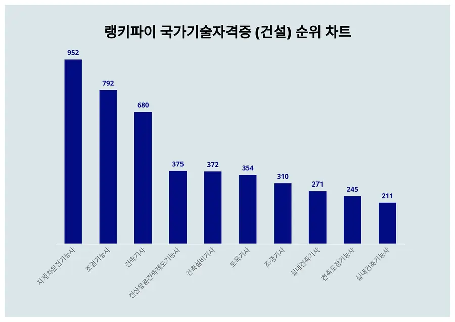 뒤를 이어 11위는 방수기능사, 12위 건축시공기술사, 13위 도시계획기사, 14위 건축산업기사, 15위 토목시공기술사, 16위 도배기능사, 17위 건축구조기술사, 18위 실내건축산업기사, 19위 건설재료시험기사, 20위는 조경산업기사 순이다.
