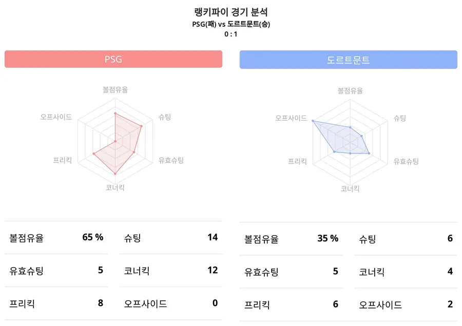 2024년 5월 8일에 진행된 2023-24 챔피언스리그 경기에서, 홈팀 PSG가 '파르크 데 프랭스'으로 어웨이팀 도르트문트를 초대해 맞붙었다. 진행된 경기는 0:1로 도르트문트가 승리했다. 이날 진행된 경기 결과 데이터는 아래와 같다.