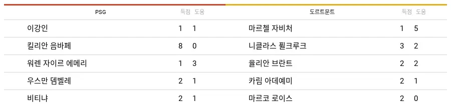 2023-24시즌 PSG와 도르트문트 사이에서 공격 포인트로 주목받은 선수들의 기록을 아래 표에서 확인할 수 있다.