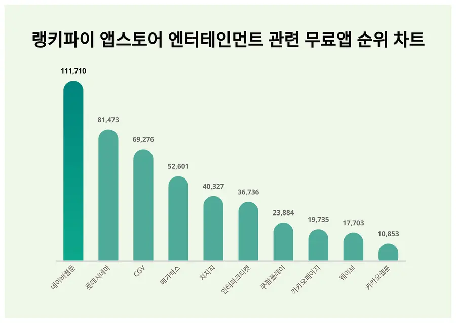 1위인 네이버웹툰은 111,710포인트로 전주보다 2,772포인트 상승했다.