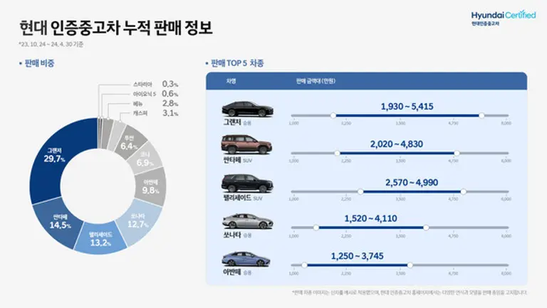 현대차 인증중고차 중에서 가장 많이 팔린 모델은 그랜저이고 제네시스 인증중고차 중에서는 G80가 최다 판매 모델인 것으로 집계됐다. 판매 가격대는 1000만 원대부터 시작해 1억 원이 넘는 매물도 있는 등 다양한 차량을 보유 중인 것으로 나타났다.