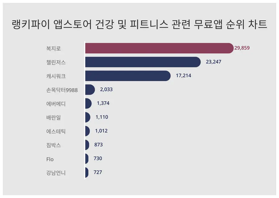 ▲앱스토어 건강 및 피트니스 관련 무료앱 트렌드 지수 분석 결과 ⓒ랭키파이