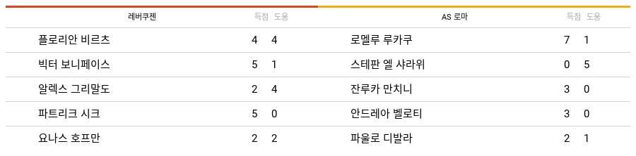 2023-24시즌 동안 레버쿠젠과 AS 로마에서 기록된 최다 공격 포인트 선수들의 데이터는 아래 표와 같다.
