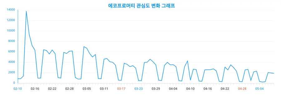아래 일간 트렌드 그래프는 에코프로머티에 대한 일간 트렌드 변화 추이가 90일간 어떻게 변화했는지를 드러내고 있다.