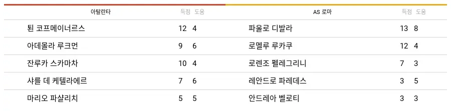 2023-24시즌 아탈란타와 AS 로마 사이에서 공격 포인트로 주목받은 선수들의 기록을 아래 표에서 확인할 수 있다.