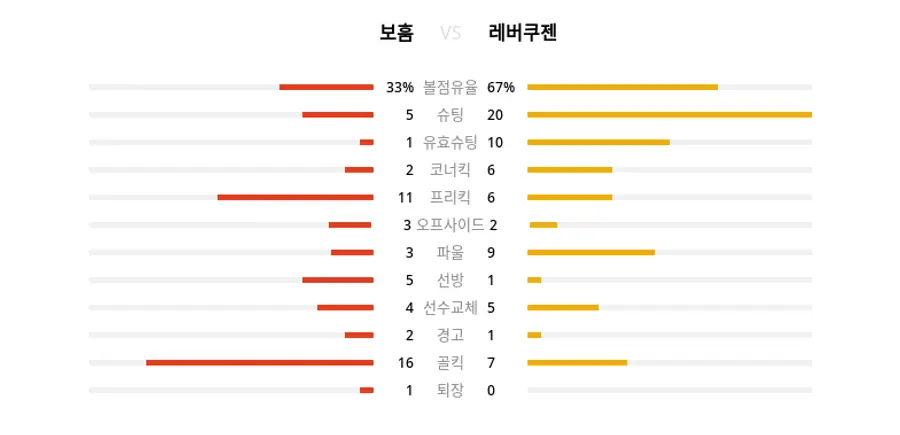2024년 5월 13일에 치뤄진 2023-24 분데스리가, 홈팀 보훔이 어웨이팀 레버쿠젠을 보노비아 루르슈타디온로 불러들여 치열한 공방 끝에 0:5 레버쿠젠이 승리했다. 경기 결과 데이터는 아래와 같다.