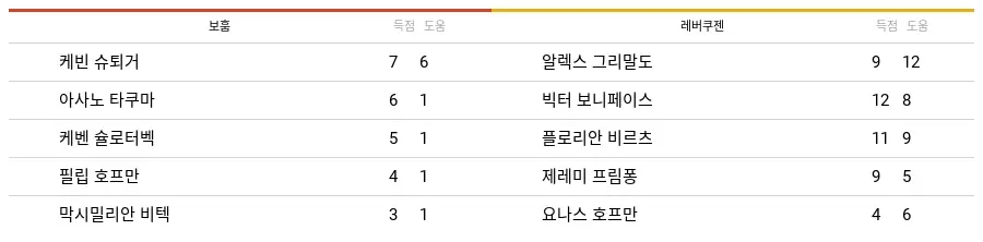 2023-24시즌 보훔과 레버쿠젠 사이에서 공격 포인트로 주목받은 선수들의 기록을 아래 표에서 확인할 수 있다.