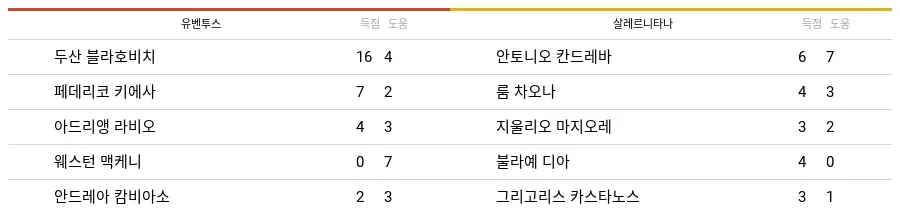 2023-24시즌 동안 유벤투스와 살레르니타나에서 기록된 최다 공격 포인트 선수들의 데이터는 아래 표와 같다.