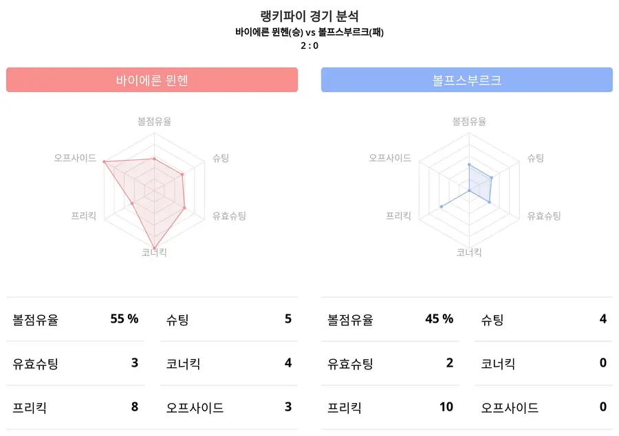 이날 바이에른 뮌헨과 볼프스부르크의 경기에서는 바이에른 뮌헨은 즈보나렉이 1득점, 고레츠카가 1득점을 기록했다. 볼프스부르크는 득점없이 경기를 마무리했다. 아래의 표를 통해 경기에 참여한 선수들의 경기 기록 데이터를 확인할 수 있다.