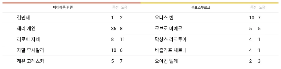 바이에른 뮌헨의 김민재는 득점 1, 도움 2를 기록하고 있으며, 해리 케인은 득점 36, 도움 8을 기록하였다.