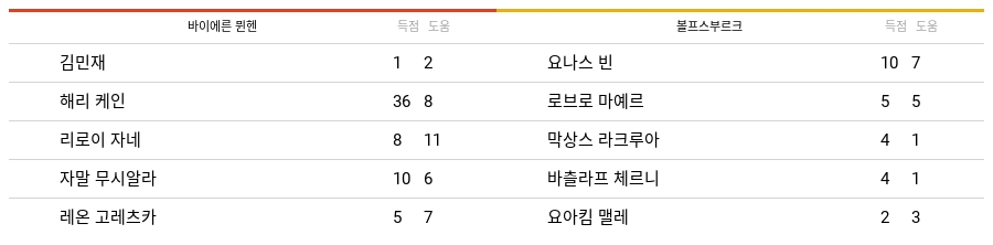 바이에른 뮌헨과 볼프스부르크의 2023-24시즌 최다 공격포인트를 기록한 선수들의 표는 아래와 같다.