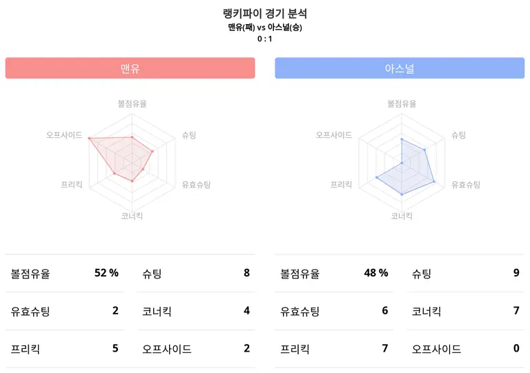 2024년 5월 13일에 치뤄진 2023-24 프리미어리그, 홈팀 맨유가 어웨이팀 아스널을 올드 트래포드로 불러들여 치열한 공방 끝에 0:1 아스널이 승리했다. 경기 결과에 대한 데이터는 아래와 같다.