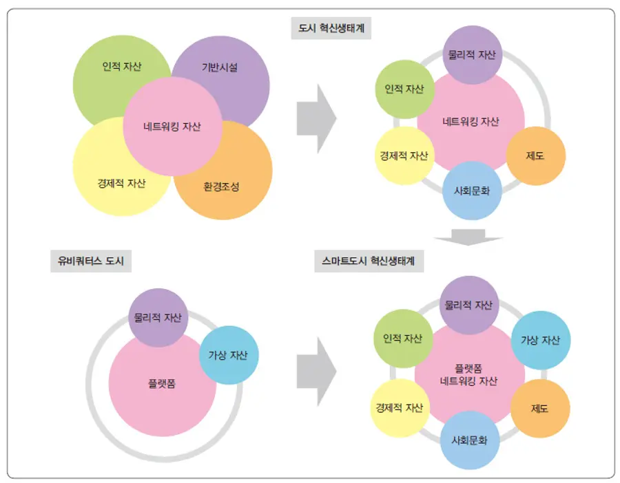 이들은 물리적 만남을 중요시하는 해외의 도시 혁신생태계 모델과 국내 유비쿼터스도시 모델을 통합한 스마트시티 혁신생태계 모델을 도출했다.