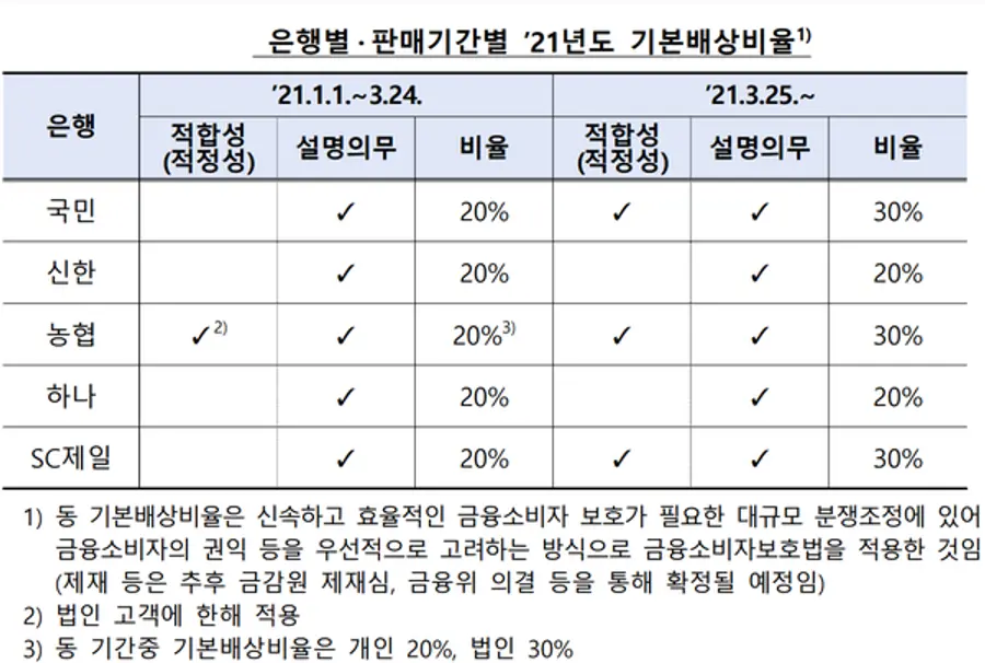 설명의무 위반 20%에 개별 사례에서 확인한 위반사항을 종합해 기본배상비율을 산정했다고 설명했다. NH농협은행이 가장 높은 비율을 받았고, 하나은행이 가장 낮은 비율로 결정됐다.