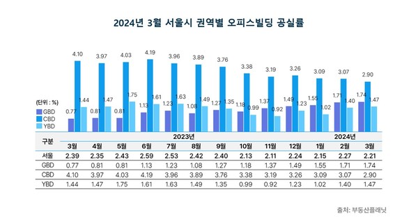 주요 권역별로는 YBD의 공실률이 직전월 1.4%에서 0.07%p 늘어난 1.47%를 기록했고 GBD는 1.71%에서 0.03%p 증가한 1.74% 수준으로 확인됐다. CBD의 3월 공실률은 2.9%로 전월 대비 0.17%p 줄었다.