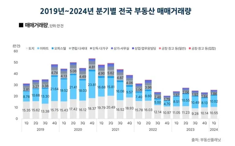 각 유형별 매매량은 공장·창고 등(집합)이 지난해 4분기 대비 24.7% 늘어 가장 큰 폭으로 늘었고, 이어서 아파트(23.3%), 토지(4%), 상업·업무용 빌딩(3.7%), 오피스텔(3.3%), 연립·다세대(1%)가 직전분기 보다 증가했다. 반면, 상가·사무실(5.8%), 단독·다가구(3.3%), 공장·창고 등(일반)(1.2%)은 줄었다.