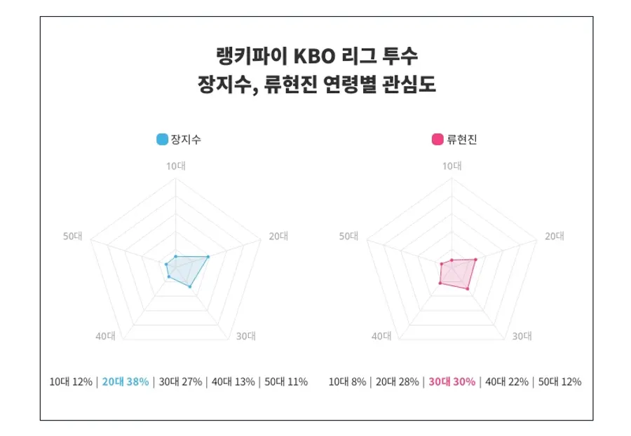 연령별 관심도 조사에서 장지수와 류현진의 관심도가 다양한 연령층 사이에서 어떻게 분포되어 있는지 명확히 드러났다. 조사 결과, 장지수는 특히 20대에서 38%의 높은 관심도를 기록하며 가장 큰 관심을 끌고 있는 것으로 나타났다. 장지수의 인기는 10대 12%, 20대 38%, 30대 27%, 40대 13%, 50대 11%순으로 이어지며, 각 연령대별에서 어떠한 관심을 받고 있는지가 조사되었다.