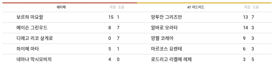 2023-24시즌 헤타페와 AT 마드리드 사이에서 공격 포인트로 주목받은 선수들의 기록을 아래 표에서 확인할 수 있다.